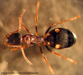 Dolichoderus quadripunctatus lässt sich sehr gut mit zuckerhaltigen Fraßködern (sogenannten Gelködern) bekämpfen. Der Vorteil dieser Gelköder ist, dass Ameisen selbstständig zum Köder kommen und den im Köder enthaltenen insektiziden Wirkstoff durch die gegenseitige Fütterung an Nestgenossinnen weitergeben. Eine Bekämpfung mit Insektensprays macht dagegen keinen Sinn, da man mit dieser Methode immer nur einen Teil der Kolonie abtöten kann. Sollte in Ihrem Haus eine Ameisnbekämpfung durch einen Kammerjäger nicht erfolgreich gewesen sein, so können Sie uns gerne mit einem Gutachten beauftragen in dem wir die Ursachen für den Mißerfolg feststellen können. In diesem Zusammenhang überprüfen wir auch, ob die Bekämpfung nach dem aktuellen Stand der Technik erfolgt ist.
